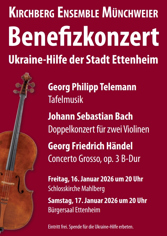 Termine: Freitag, 16. Januar 2026, 20 Uhr – Schlosskirche Mahlberg Samstag, 17. Januar 2026, 20 Uhr – Bürgersaal Ettenheim Der Eintritt ist frei; Spenden zugunsten der Ukraine-Hilfe werden herzlich erbeten.