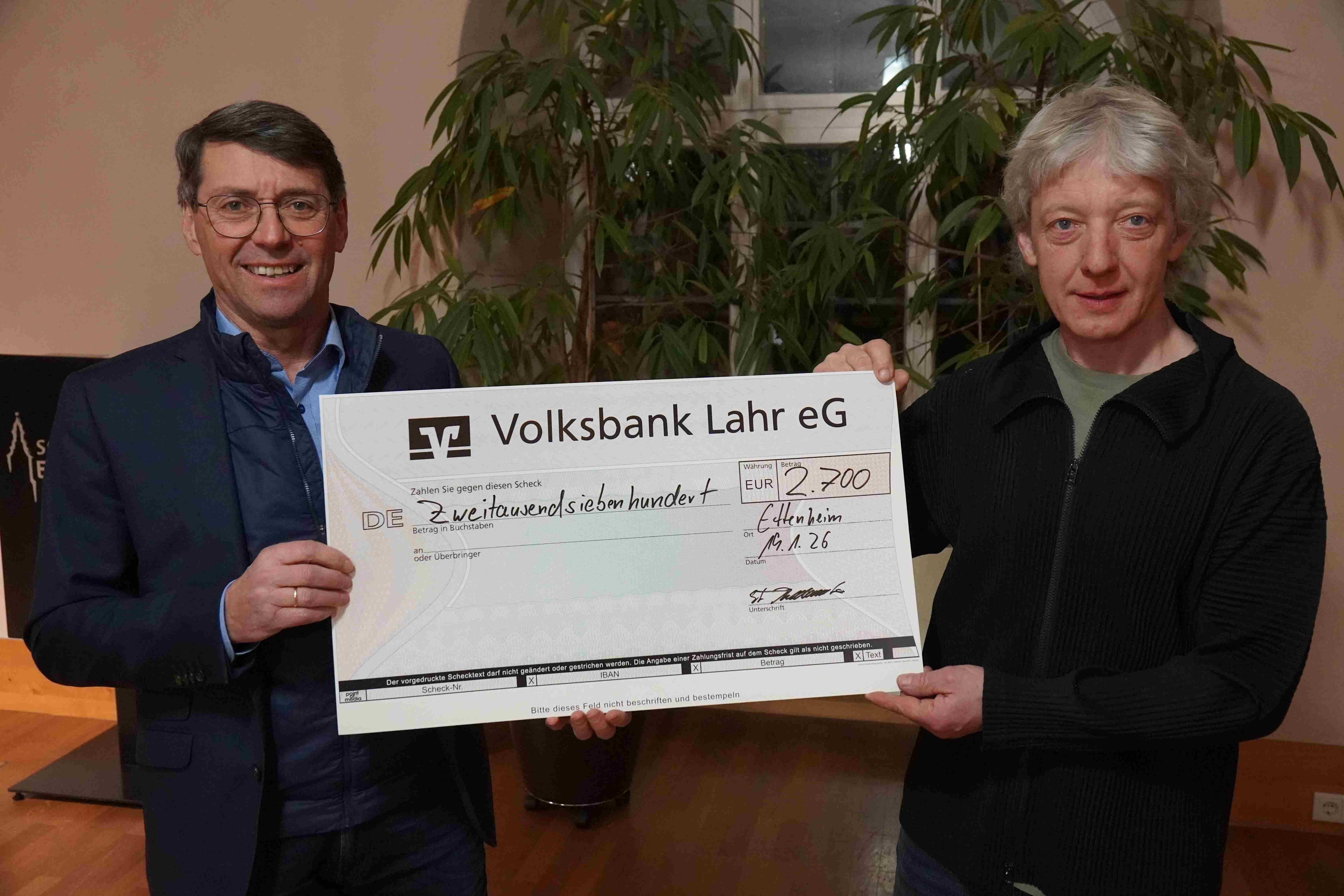 Der Eintritt war frei, Spenden wurden herzlich erbeten. Das Ergebnis kann sich sehen lassen: Insgesamt kamen 2.700 Euro zusammen. Die Spendensumme wurde von Ensembleleiter Stefan Krattenmacher an Bürgermeister Bruno Metz übergeben, der sich im Namen der Stadt Ettenheim herzlich für das Engagement bedankte.