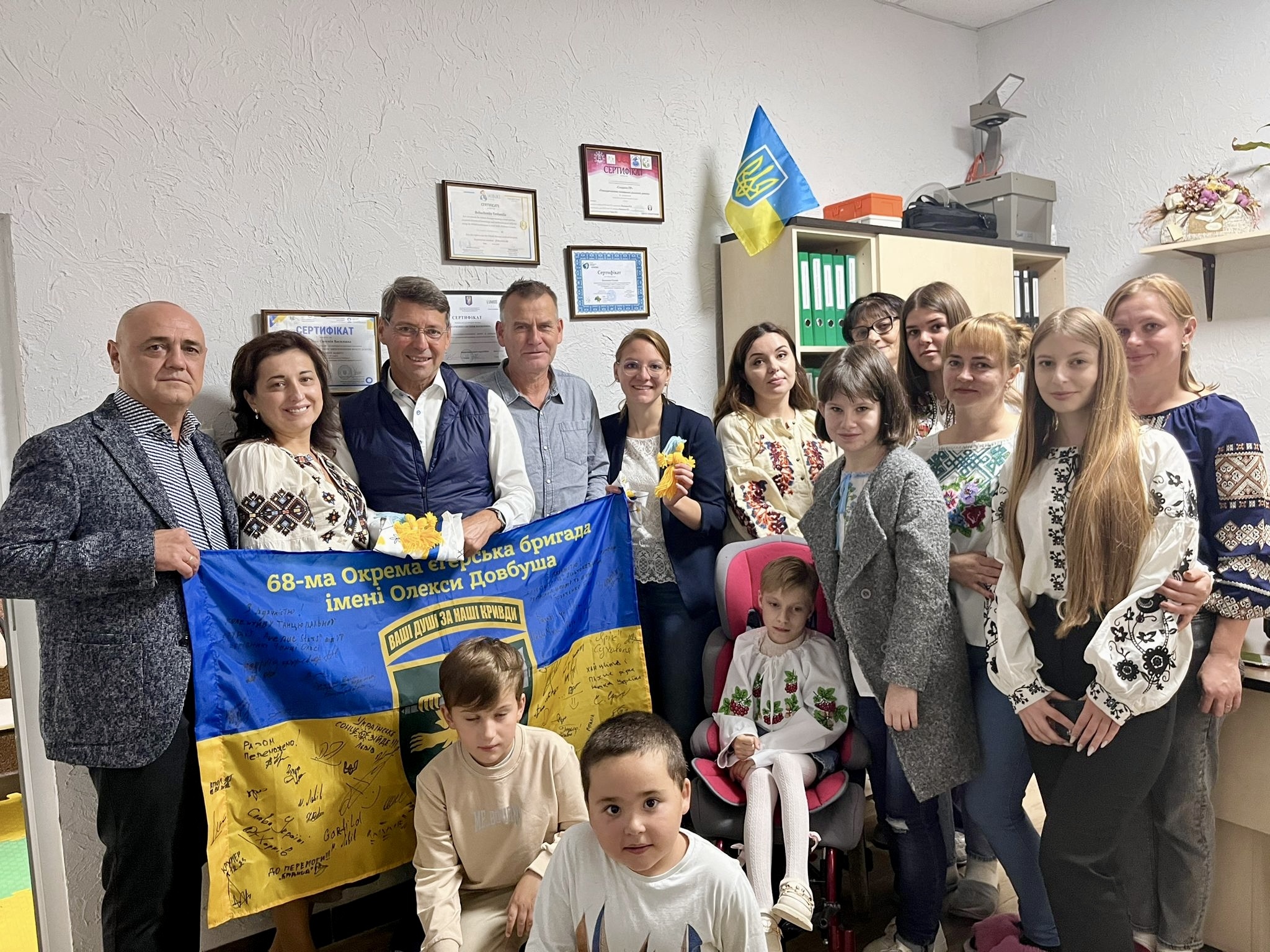 In der ukrainischen Stadt wird viel unternommen, um das Gemeinschaftsleben aufrechtzuerhalten, sich auch um die Schwächeren zu kümmern, z.B. im Inklusions- und Rehabilitationszentrum für Menschen und Kinder mit Behinderung. Die Einrichtung in Vilkhovetska hat ebenso wie die Stadt selbst zahlreiche traumatisierte Kinder und durch den Krieg verletzte Menschen aufgenommen und behandelt. In der Reha-Einrichtung werden vor allem Kindern mit körperlichen Beeinträchtigungen betreut und deren sensorische und motorische Fähigkeiten gefördert. „Der Umgang mit ihnen ist rührend, von hoher Empathie geprägt“, berichtet Julia Zehnle. „Der Einsatz der Pflegenden ist enorm. Auch aus dieser Therapeutenrunde musste ein junger Mann in den Krieg. Für ihn und seine Kameraden wurden teilweise Powerbanks, warme Kleidung und Thermoskannen im letzten Herbst geliefert“, so die Hauptamtsleiterin. Als Dank bekam die Ettenheimer Gruppe eine Flagge des Bataillons mit den Unterschriften und Dankesworten aller Soldaten überreicht.