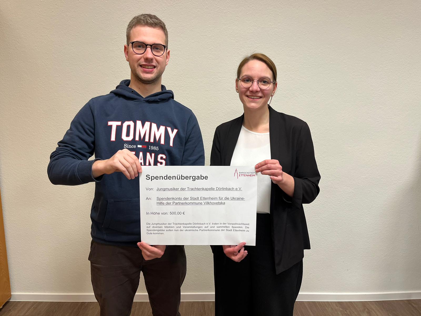 Dank des großartigen Engagements der jungen Musikerinnen und Musiker der Trachtenkapelle Dörlinbach sowie der großzügigen Spenden ihrer Zuhörerinnen und Zuhörer konnte das Spendenkonto der Ukraine-Hilfe erneut aufgestockt werden. Denn in der Vorweihnachtszeit haben die Jungmusikerinnen und –musiker gezeigt, was es bedeutet, als Gemeinschaft zusammenzustehen. Mit ihren stimmungsvollen Auftritten auf verschiedenen Märkten und Veranstaltungen schufen sie nicht nur musikalische Höhepunkte, sondern sammelten gleichzeitig Spenden für einen wichtigen Zweck. Stellvertretend überreichte Lukas Wangler, stellvertretender Jugendleiter der Trachtenkapelle einen Scheck über 500 Euro an die Ettenheimer Hauptamtsleiterin Julia Zehnle.