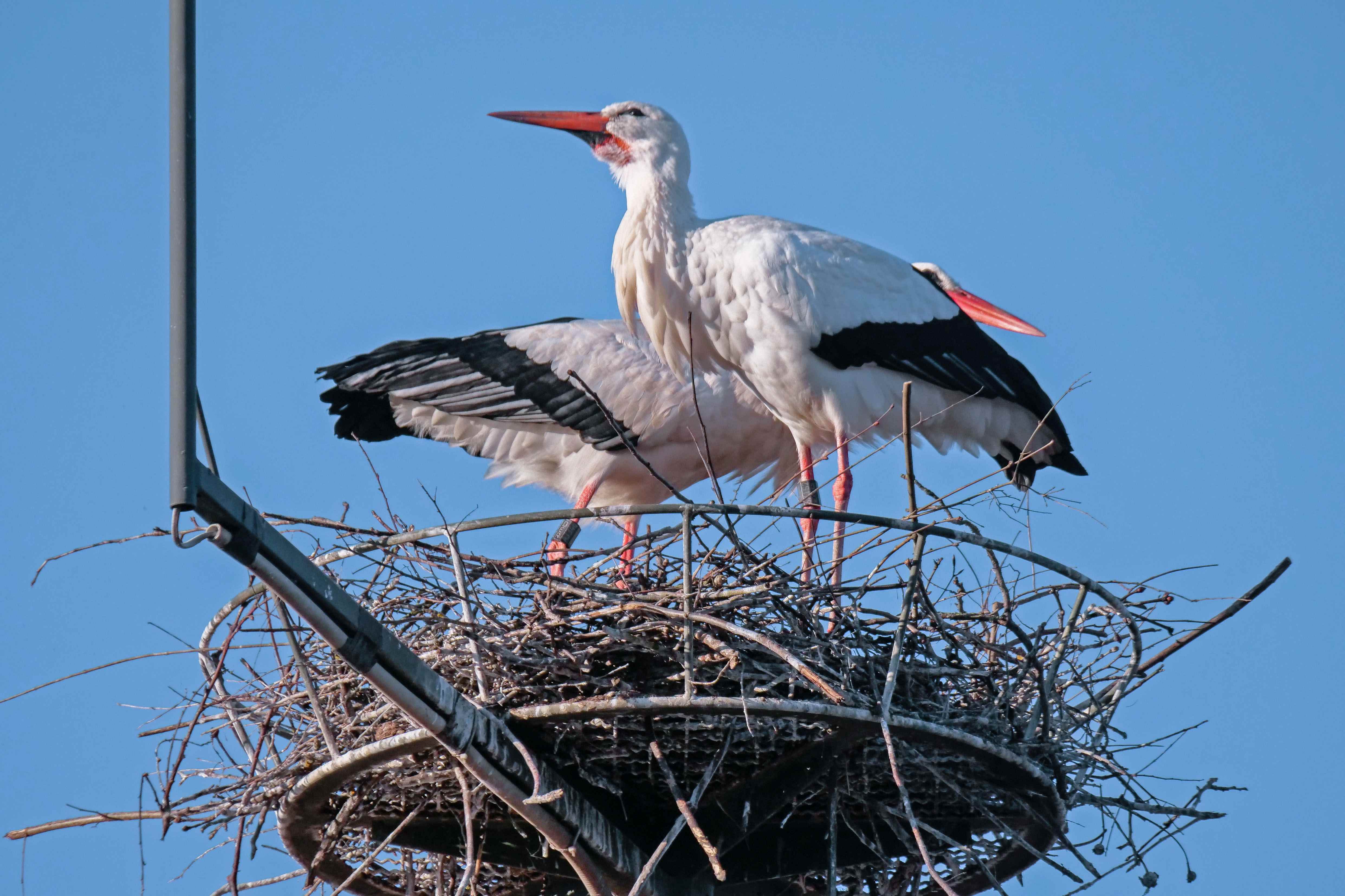 Wenn das erste Ei im Nest liegt, werden diese im Abstand von etwa 1,5 Tagen abgelegt und gleich bebrütet. Wenn ein Storch (oft kaum von unten erkennbar) sitzt, nur gelegentlich kurz aufsteht und in der Nestmitte herumzupft, kann man davon ausgehen, dass gebrütet wird. Die Küken werden nach einer Brutzeit von 32 Tagen nacheinander schlüpfen, unterschiedlich alt sein und unterschiedlich kräftig heranwachsen.