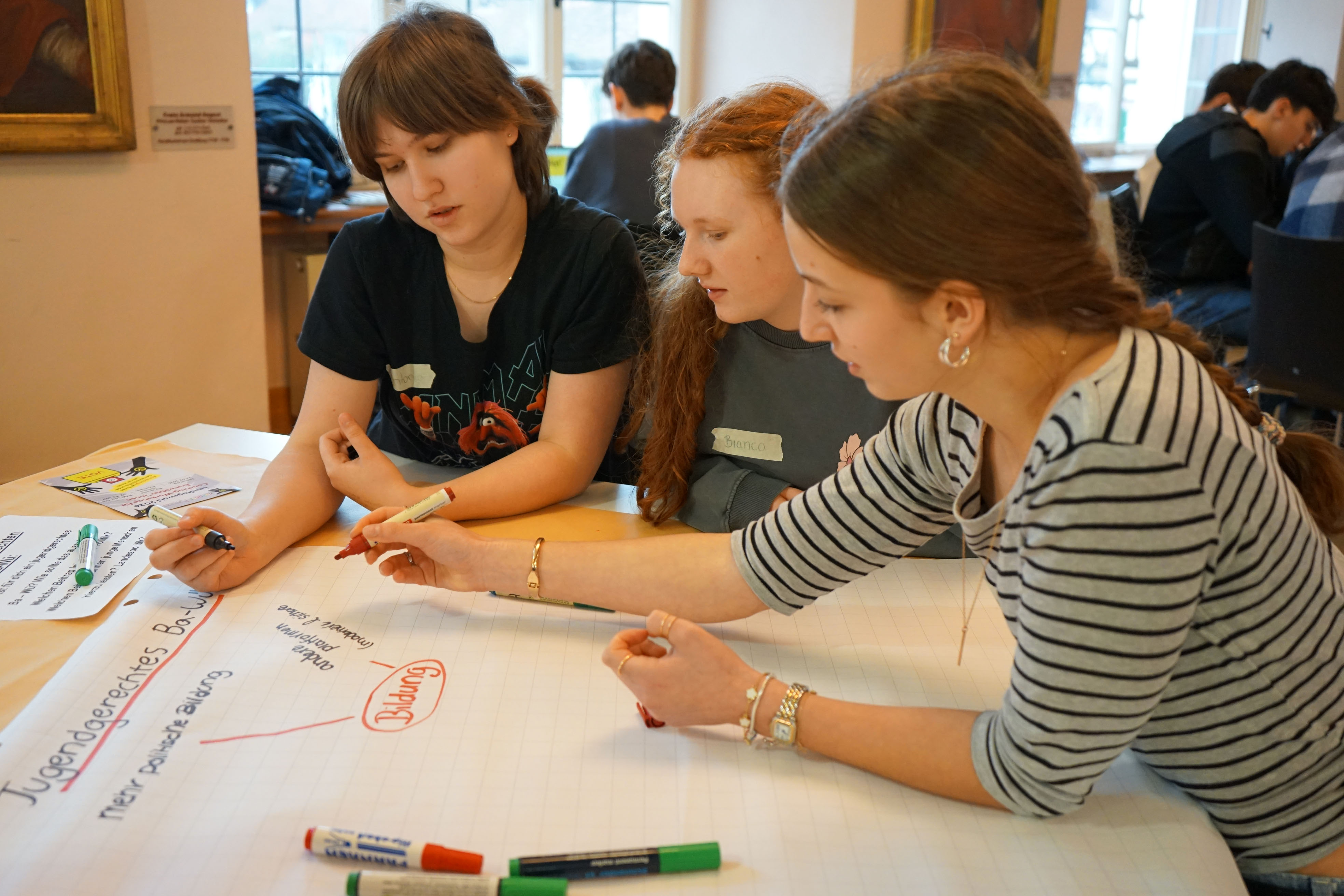Ein weiterer Schwerpunkt lag auf der Rolle der Jugendlichen als Multiplikatorinnen und Multiplikatoren. In Arbeitsgruppen entwickelten sie Ideen, wie sie Mitschülerinnen und Mitschüler für politische Themen und insbesondere für die Teilnahme an der Landtagswahl begeistern können. Dabei wurden wichtige Moderationskompetenzen wie Selbstbewusstsein, Kreativität, Zuhörfähigkeit, klare Struktur und spontane Reaktionsfähigkeit herausgearbeitet.
