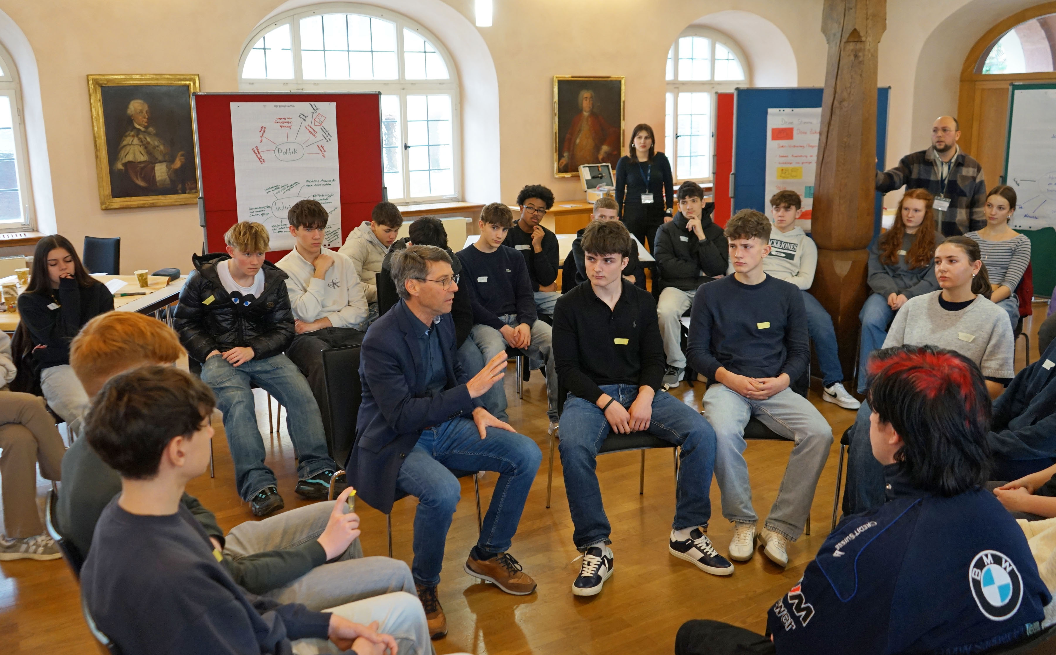 Zum Abschluss des Workshops hatten die Schülerinnen und Schüler in einer Diskussionsrunde nochmals die Gelegenheit, mit Bürgermeister Bruno Metz direkt ins Gespräch zu kommen, ihm gezielt Fragen zu stellen und aktuelle kommunal- und landespolitische Themen offen zu diskutieren.