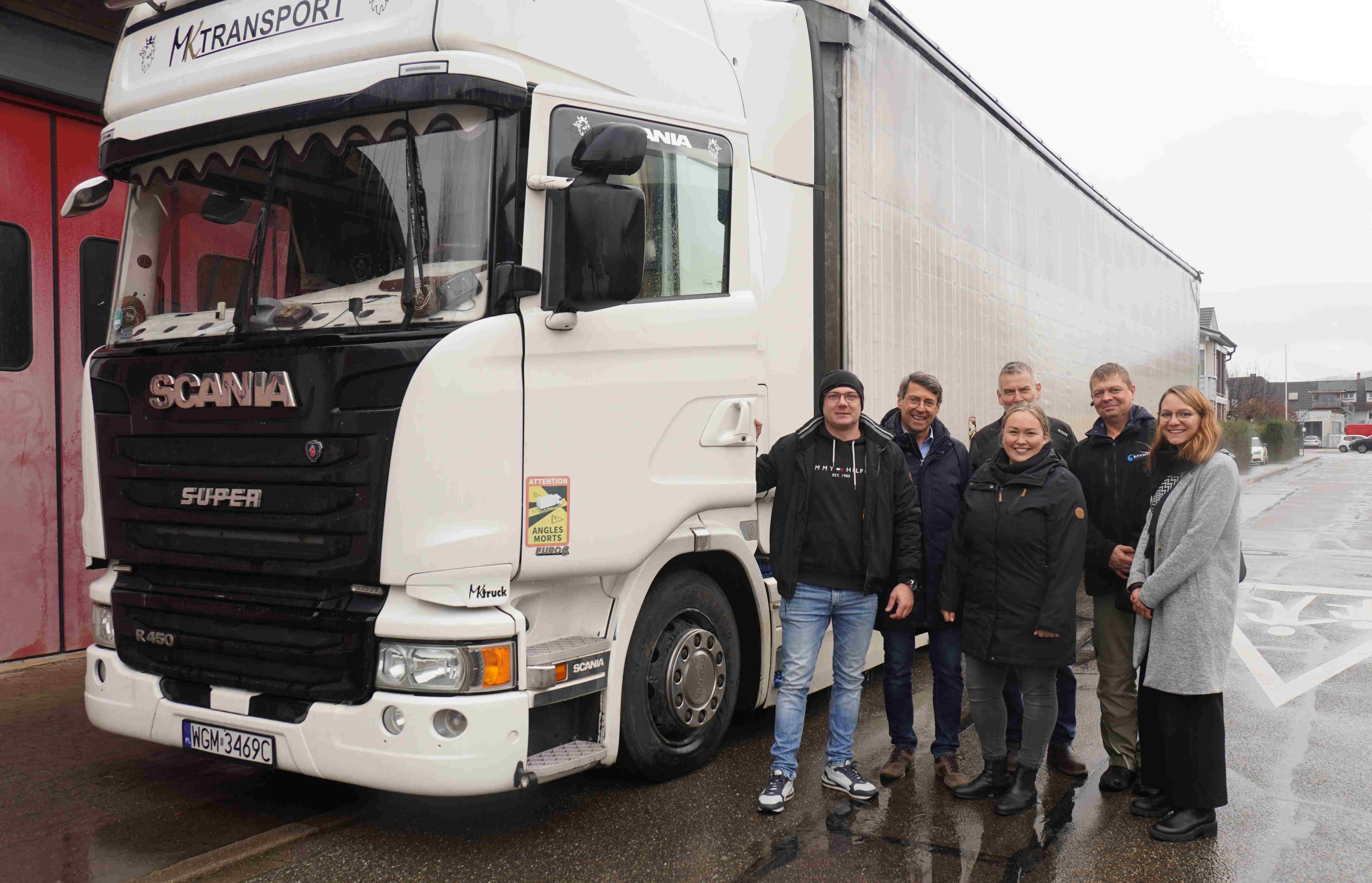 Bildquelle: Stadt Ettenheim - v.l. LKW-Fahrer Marcin Kamieniarz, Bürgermeister Bruno Metz, Kristian Herdick, Aline Köbele (Stadt Ettenheim), Andreas Schwindt (Transportunternehmen Schwindt) und Julia Zehnle (Stadt Ettenheim).
