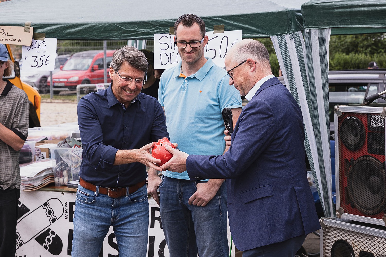 Eröffnet wurde die Einweihung mit einer Sparschweinübergabe durch Jürgen Riexinger, Vorstandsvorsitzender der Sparkasse Offenburg/Ortenau an Bürgermeister Bruno Metz. Die Sparkassenstiftung unterstützte den neuen Skate-Platz mit einer Spende in Höhe von 50.000 Euro, ohne die die Umgestaltung nicht möglich gewesen wäre. Bürgermeister Bruno Metz begrüßte und dankte allen Beteiligten ausdrücklich – insbesondere Björn Zerr vom Tiefbauamt als Projektverantwortlichen.