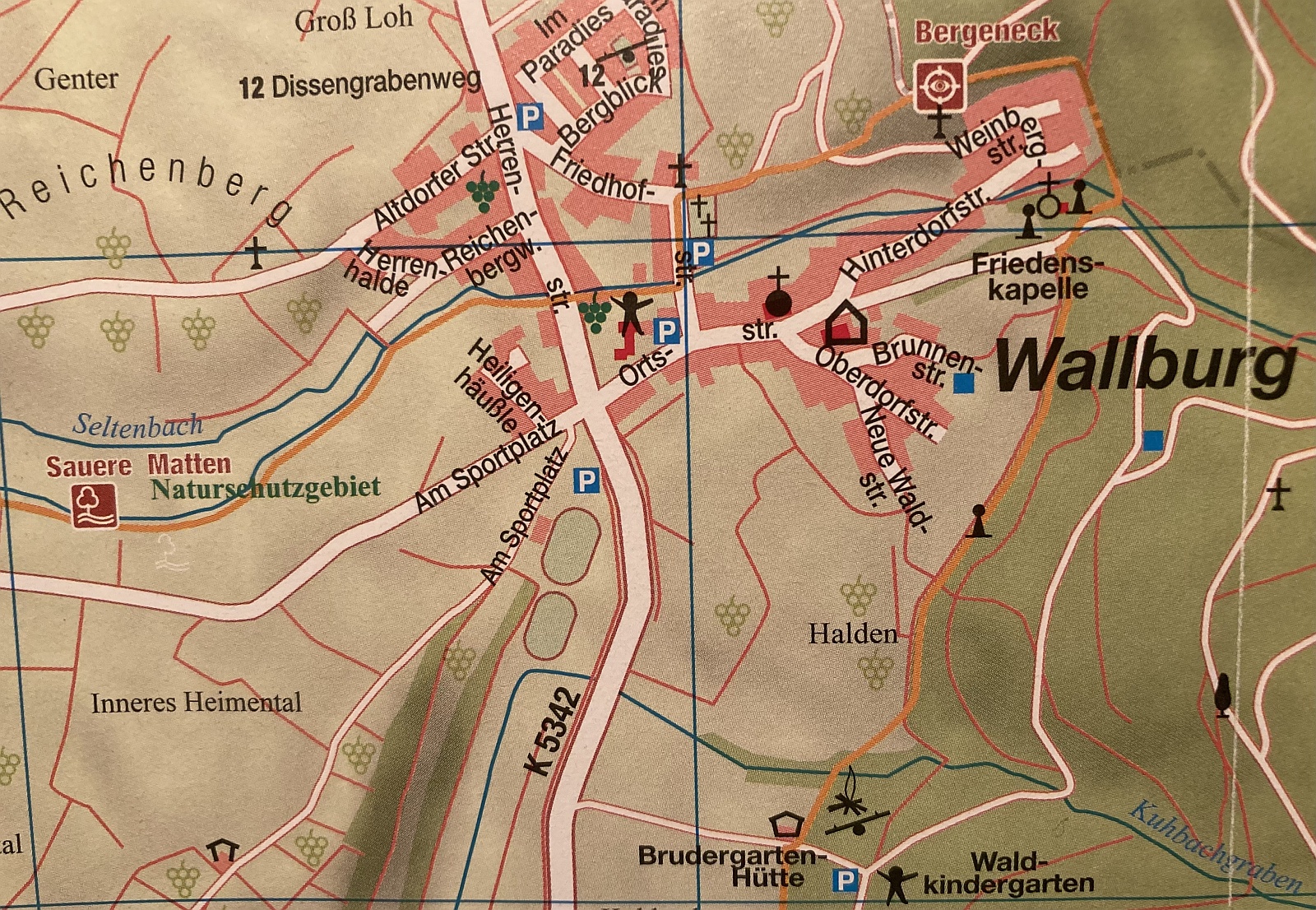 Dabei ist die Straße schon recht kurios: Auf dem offiziellen Stadtplan von Ettenheim sieht man, wie sie sich gabelt, einmal in Richtung Westen und damit Richtung Kernstadt (Heimschule), sowie in einen zweiten Straßenabschnitt, der zu den beiden Sportplätzen des SC Wallburg führt, wo dann besagter Briefkasten hängt.