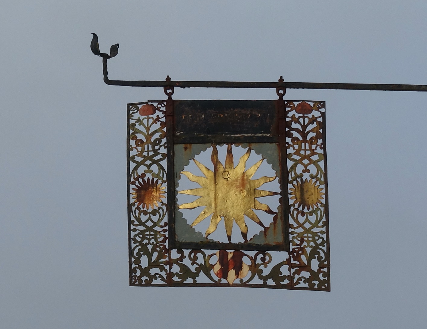 Schild vom Gasthaus Sonne Ettenheimmünster (mit dem Badischen Wappen sowie links und rechts zwei Sonnen und zwei roten Blumen, die als Rosen gedeutet werden können und damit einen Hinweis auf den Erbauer des Gebäudes Abt Dornblueth geben, der in seinem Abtswappen u. a. Rosen hatte)