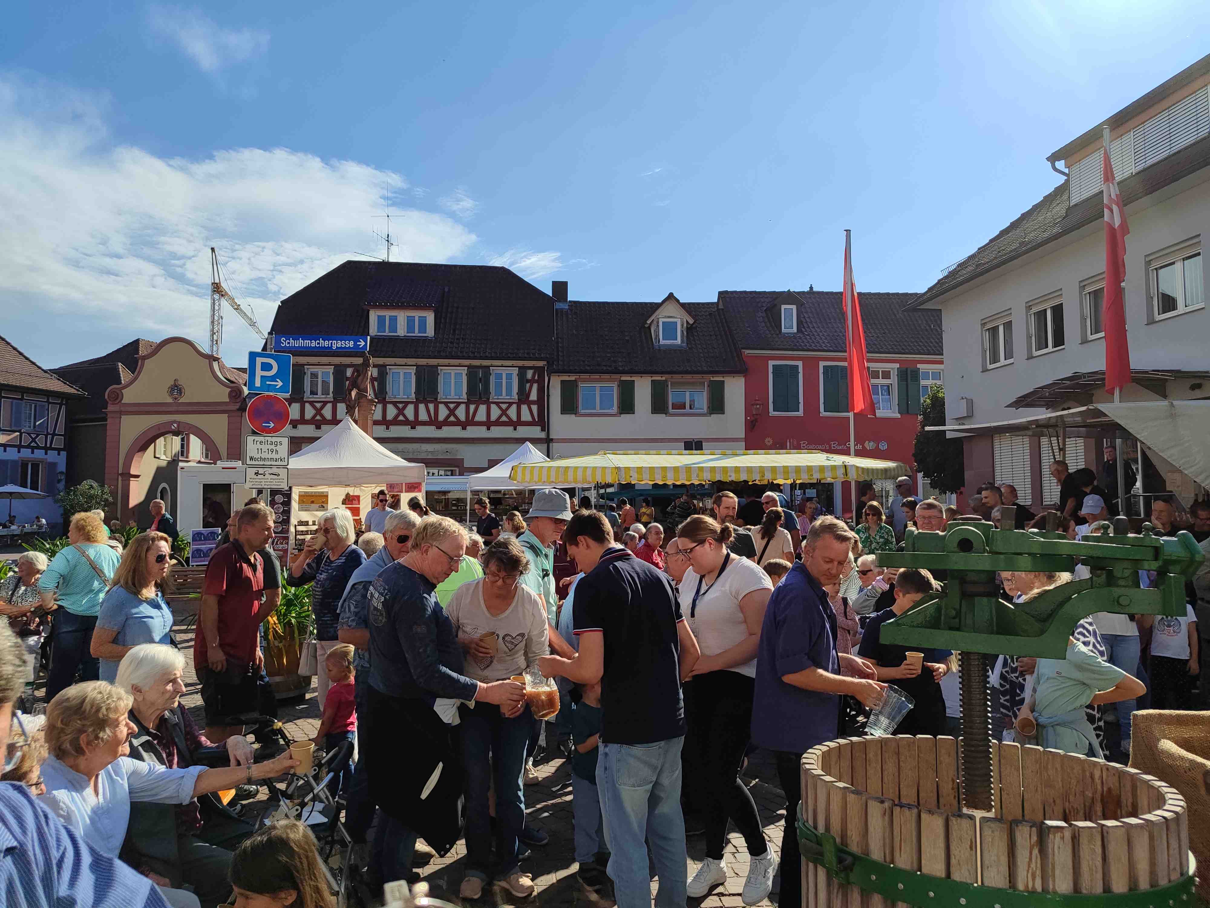Der Wochenmarkt findet von 14 bis 18 Uhr statt. Das Trotten beginnt um 15.30 Uhr. Anschließend wird der frische Traubensaft zum Probieren ausgeschenkt. Zudem gibt es neuen Süßen und Zwiebelkuchen, Grillwürste, Hamburger, Veggieburger, Kaffee und Waffeln.
